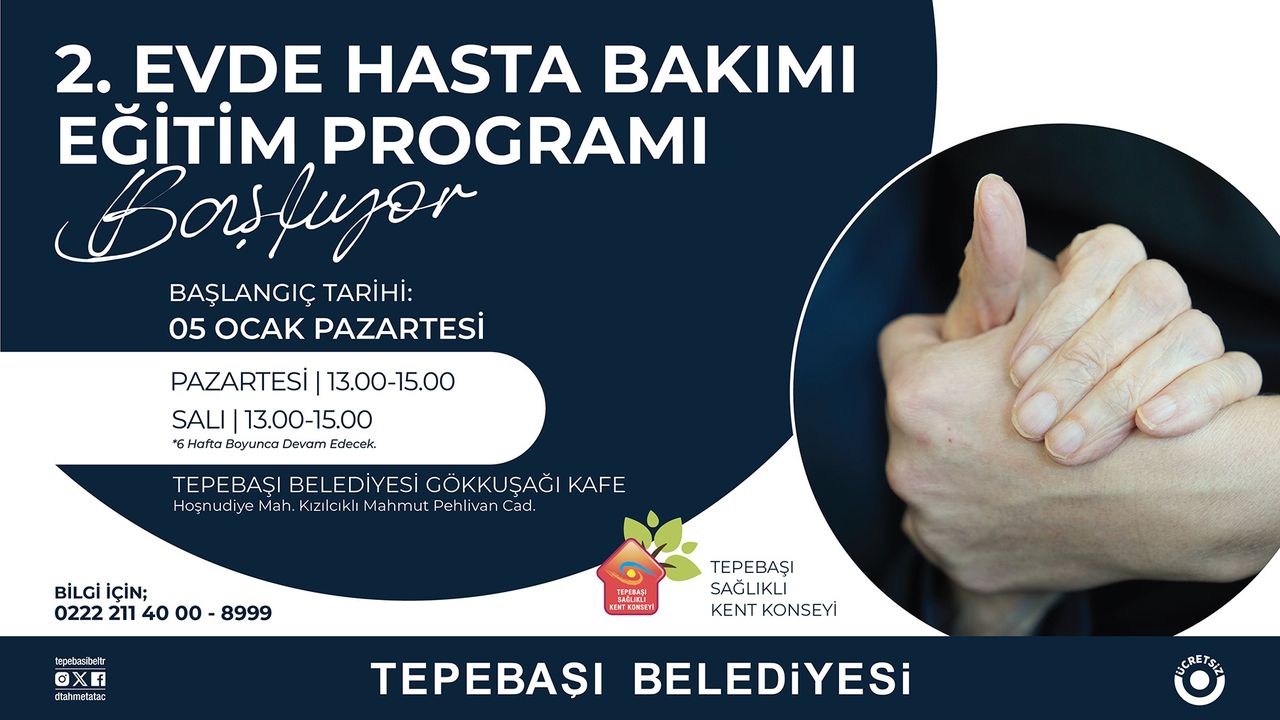 Tepebaşı Belediyesi ve Tepebaşı Sağlıklı Kent Konseyi iş birliği ile düzenlenen evde hasta bakımı eğitim programının ikincisi başlıyor. Özdilek Sanat Merkezi’nde gerçekleşecek olan eğitim programı 5 Ocak Pazartesi günü başlayacak. Eğitim, her hafta Pazartesi ve Salı günleri 13.00-15.00 saatleri arasında gerçekleşecek. Suzan Ataman Tüzel tarafından verilecek eğitim programı 6 hafta sürecek.
