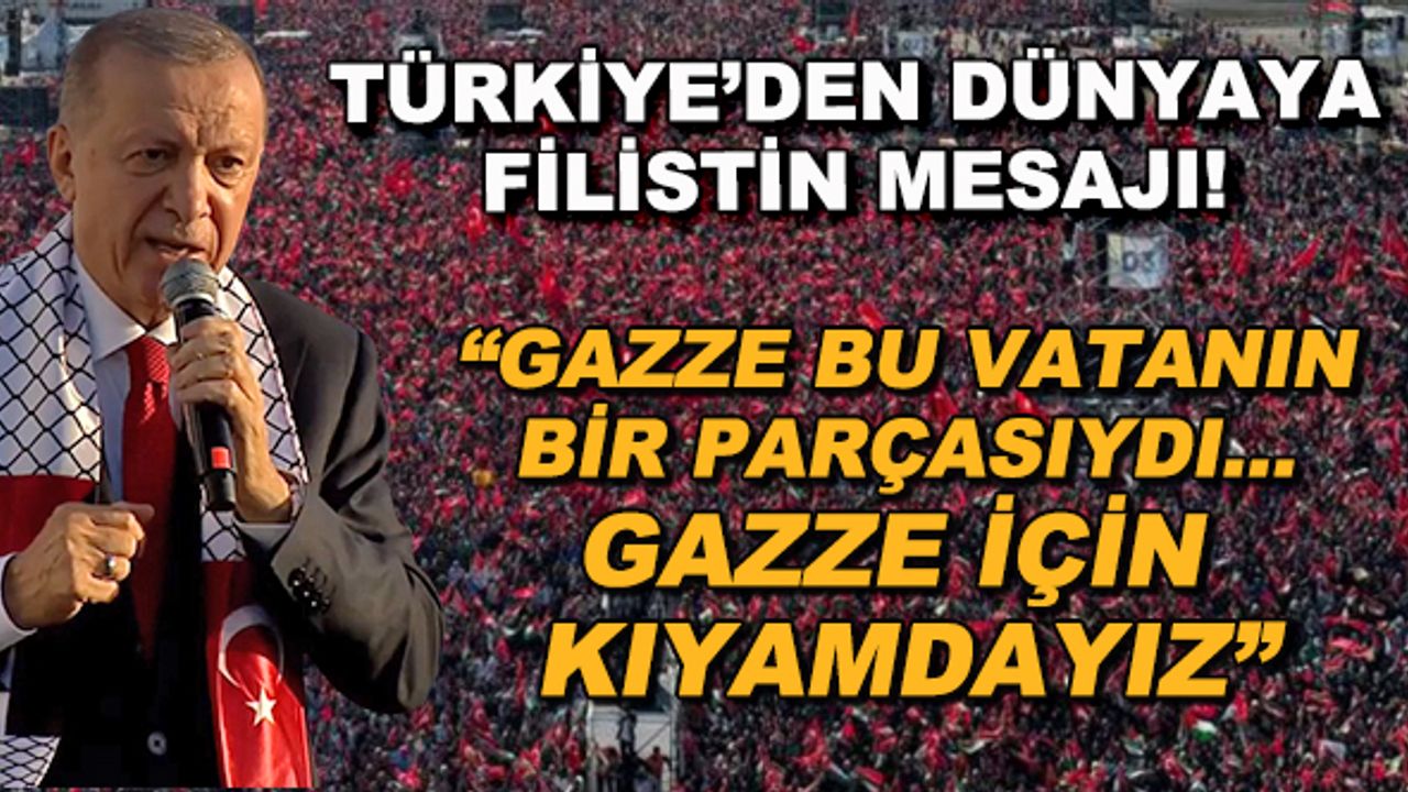 Cumhurbaşkanı Recep Tayyip Erdoğan, Atatürk Havalimanı'nda düzenlenen "Büyük Filistin Mitingi"nde açıklamalarda bulunuyor. Erdoğan, "Ufkumuzun uzandığı her yerde kalplerini ve gözlerini bize çevirmiş kardeşlerimizin derdi ile dertlendiğimiz yardım eli uzattığımız gerektiğinde sınırlarımızı açtığımız kardeşlerimize yaptığımız gibi Gazze için de bugün olduğu gibi kıyamdayız" dedi.