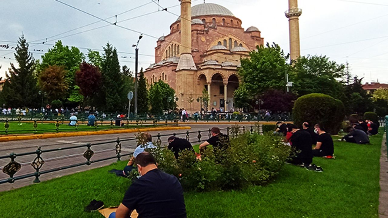 Bugün Eskişehir için meteorolojinin yağmur uyarısına rağmen Reşadiye Cami’nin avlusunu dolduran cemaatin genellikle ağaç altlarını tercih ettiği görüldü.
