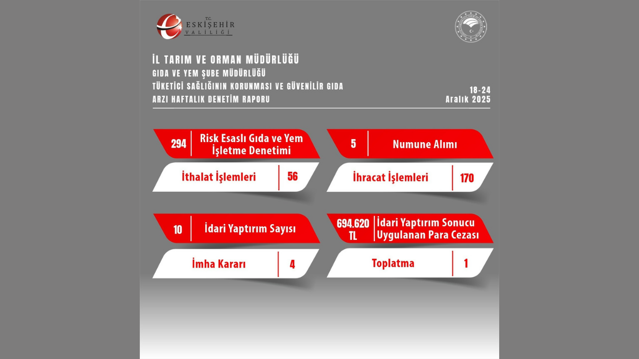 Eskişehir İl Tarım ve Orman Müdürlüğü, tüketici sağlığının korunması ve güvenilir gıdaya erişimin sağlanması amacıyla 18-24 Aralık 2025 tarihleri arasında gerçekleştirdiği denetim çalışmalarının sonuçlarını açıkladı.