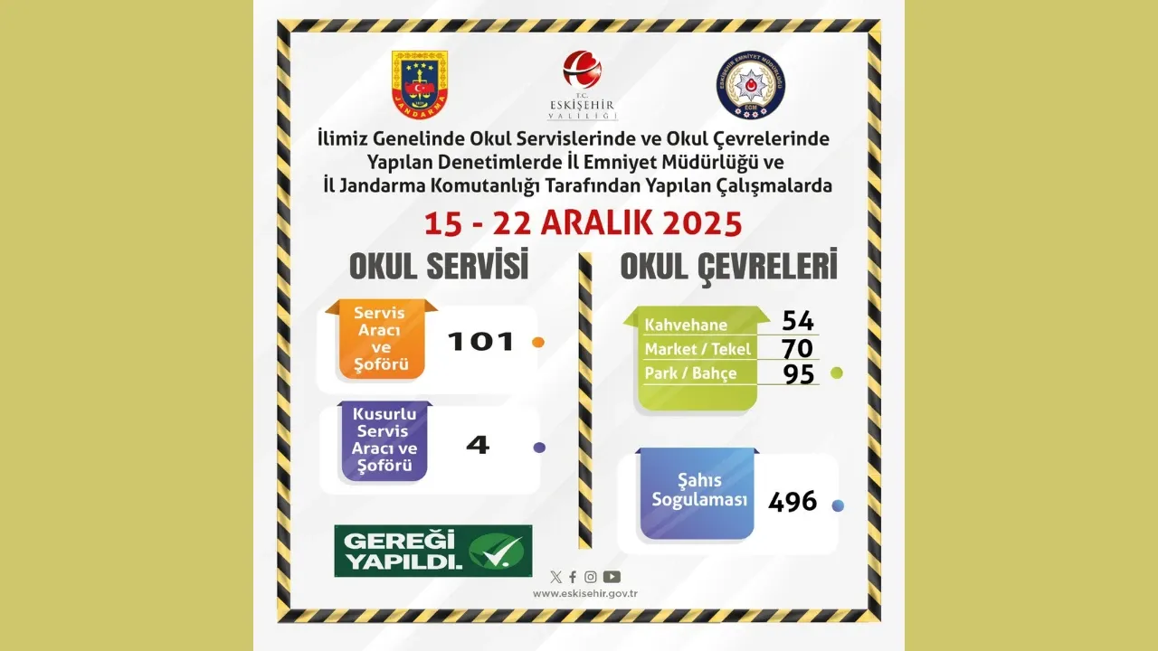 Eskişehir genelinde eğitim gören öğrencilerin güvenliğini en üst seviyede tutmak amacıyla İl Emniyet Müdürlüğü ve İl Jandarma Komutanlığı ekipleri tarafından geniş kapsamlı bir güvenlik operasyonu gerçekleştirildi. 15–22 Aralık 2025 tarihleri arasında kentin dört bir yanındaki okul çevrelerinde ve öğrenci servislerinde eş zamanlı olarak yürütülen denetimlerde, hem sürücüler hem de şüpheli şahıslar mercek altına alındı. Eğitim ortamının huzurunu bozabilecek her türlü olumsuzluğa karşı yürütülen bu operasyon kapsamında, yüzlerce kişi sorgulanırken çok sayıda işletme de kontrol edildi.