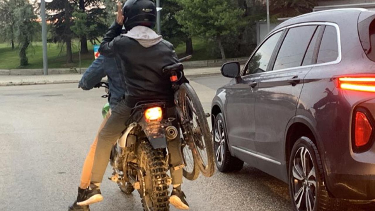 Motosiklet sürücüsünün arkasındaki yolcu, trafiği hiçe sayarak yanında bisiklet taşıdı. Aynı zamanda plakasız motosiklet ile yolculuk yapan iki şahıs, çevredeki sürücülerin hayret dolu bakışları arasında gözden kayboldu.