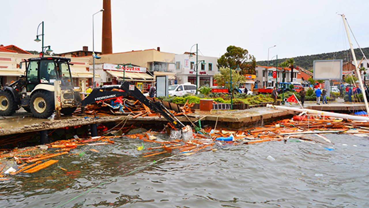 Balıkesir’in Ayvalık ilçesinde, dün sabah meydana gelen şiddetli fırtına ve olumsuz hava koşulları nedeniyle zarar gören gezi ve balıkçı teknelerinin yanı sıra çatıları uçan evlerde enkaz kaldırma çalışmaları sürüyor. Ayvalık’ta olumsuz hava koşullarından en çok zarar gören ilçe merkezindeki Cumhuriyet Meydanı’nda parçalanarak batan gezi teknelerinin enkazları Ayvalık Belediyesi, Balıkesir Büyükşehir Belediyesi, Sahil Güvenlik ve AFAD ekipleri tarafından denizden çıkarılmaya çalışılıyor.