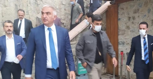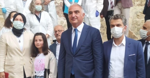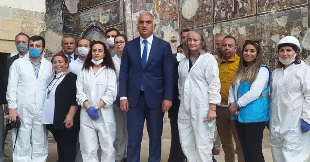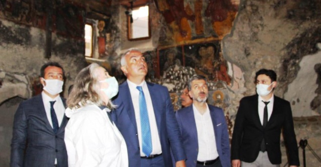 Bakan Ersoy, “Burada bir de duvarlarda çok önemli freskler var, çatı bölümlerinde tavanlarda. Bu fresklerde renklendirme ve canlandırma çalışmaları devam ediyor”