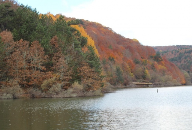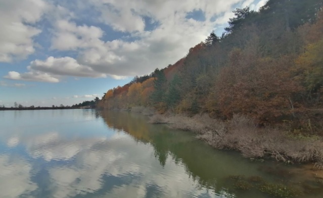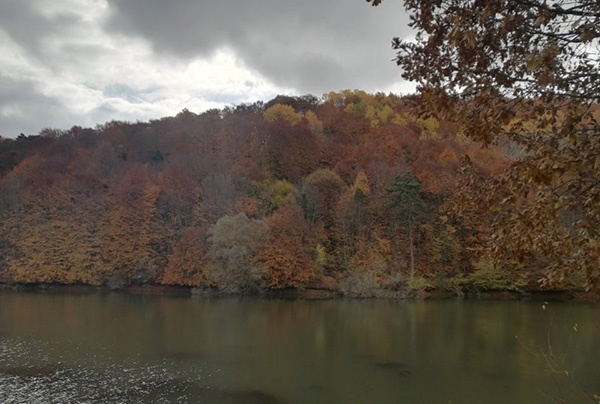 Yeşil çam ormanları arasında kalan yapraklı ağaçların sarı ve kızıla büründüğü tabiat parkında, sonbaharın gelişiyle muhteşem kartpostallık doğa manzaraları görülüyor.