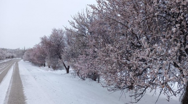 Havaların ısınmasıyla çiçek açan ağaçlar da kar yağışıyla birlikte yeniden beyaza büründü.