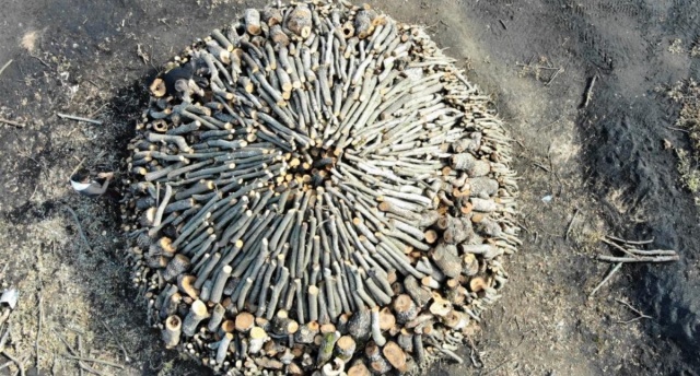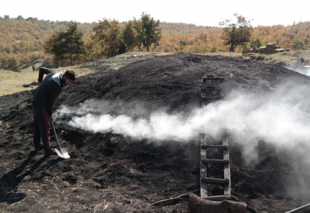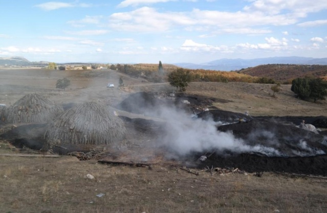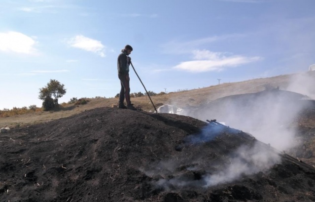 "Öncelikle odunları kesiyoruz. Bu da en az 20-30 gün sürüyor. Ondan sonra o odunları topluyorsun. 20 römorkla bir ocak oluşuyor. Odunları dizdikten sonra üzerine samanla örtüyoruz. Sonra bunun üstüne toprak atıyoruz."