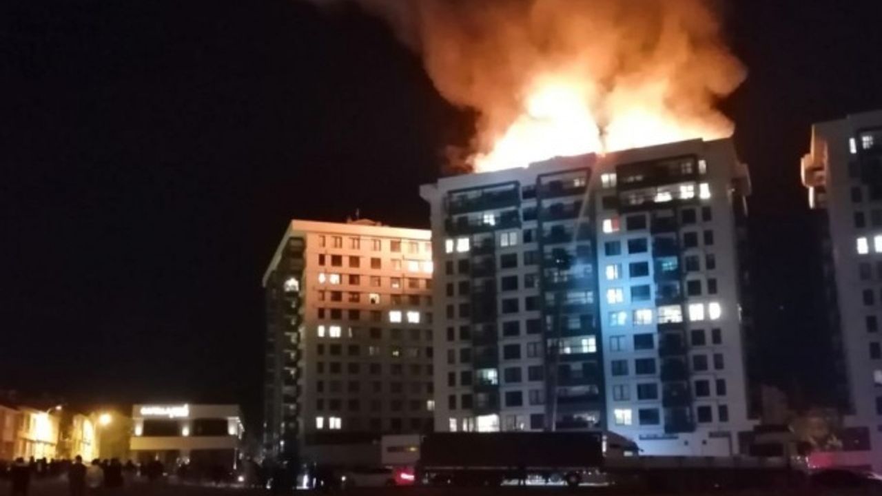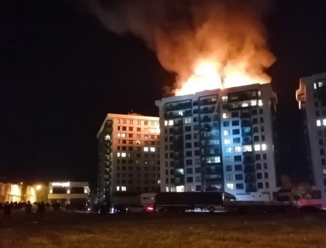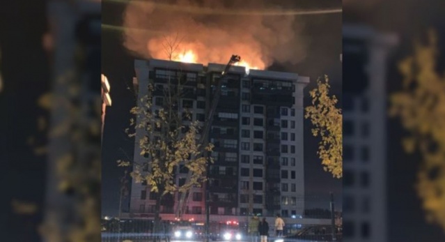 Akşam saatlerinde çıkan yangında tüm blok boşaltılırken, yangında apartman çatısı alevlere büründü, ekipler seferber oldu.