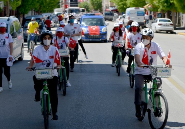 Tepebaşı Belediyesi önünden başlayan kutlama kortejinde Başkan Ataç ve Milletvekili Süllü, bisiklete de bindi.