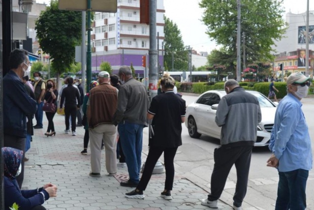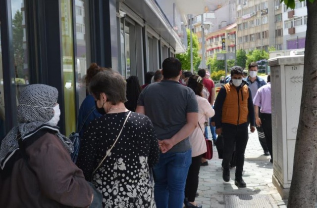 Eskişehir’de, tam kapanmanın ardından açılan işyerlerine taksit ve fatura ödemelerini yapmak isteyen vatandaşlar işlek caddelerde sosyal mesafesiz uzun kuyruklar oluşturdu.