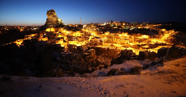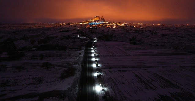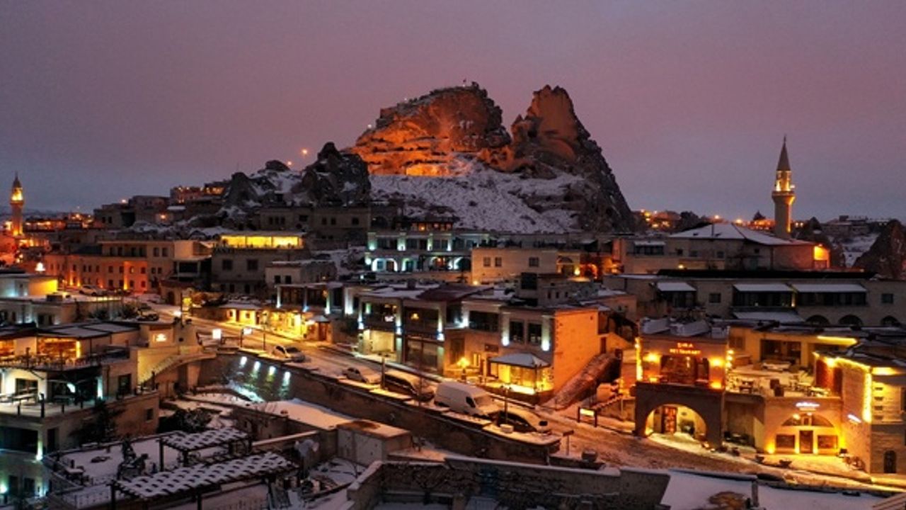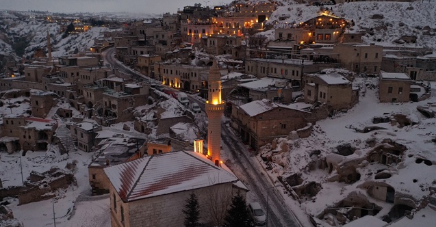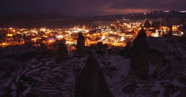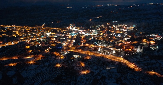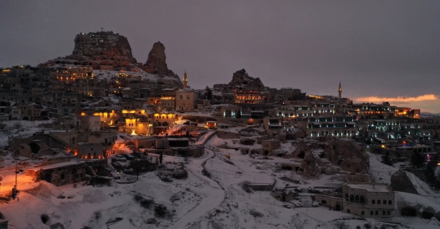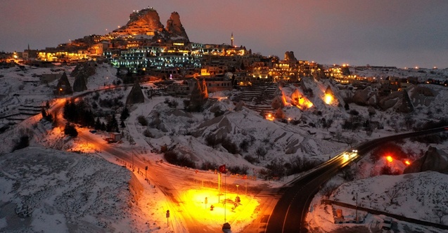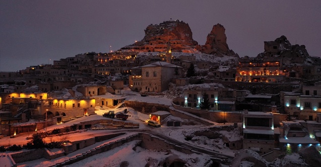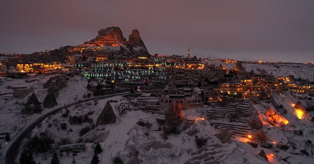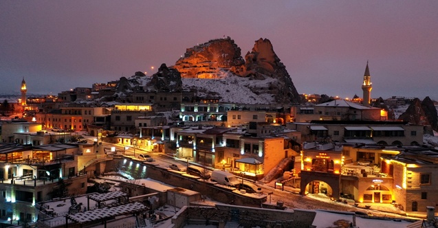 Nevşehir'de iki gündür etkili olan kar yağışı, turistlerin uğrak yerlerinden Göreme, Uçhisar ve Ortahisar beldelerindeki peribacaları ve doğal kaya oluşumlarını beyaza bürüdü.