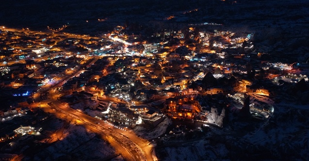 Türkiye'nin önemli turizm merkezlerinden Kapadokya'da, karla kaplı vadiler havadan görüntülendi.
