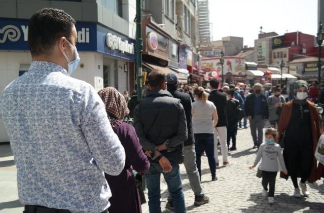 Ramazan Bayramı’nı da kapsayan tam kapanmaya bir gün kala Eskişehir'de vatandaşlar çarşılara akın etti. Sosyal mesafenin hiçe sayıldığı saatlerde insanların banka, kuruyemişçi ve giyim mağazaları önünde oluşturduğu kuyruklar pes dedirtti.