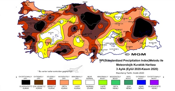 Meteoroloji Genel Müdürlüğü'nün yayınladığı "Standart Yağış İndeksi Metoduna Göre 2020 Kasım Ayı Meteorolojik Kuraklık Durumu" başlıklı harita, Türkiye'nin Eylül 2020-Kasım 2020 arasındaki 3 aylık dönemi kapsayan kuraklık haritasını göstermekte. Harita, Türkiye'nin karşısındaki kuraklık tehdidinin ciddi boyutta olduğunu ortaya koydu. Haritaya göre, Türkiye'nin önemli bir bölümü Olağanüstü Kurak-Çok Şiddetli Kurak-Şiddetli Kurak kategorilerine girerken, önemli bir diğer bölümü de Orta Kurak kategorisinde yer alıyor. Normal Kurak olarak nitelenen bölgeler ise parçalı ve küçük bölgelerden oluşmakta.
