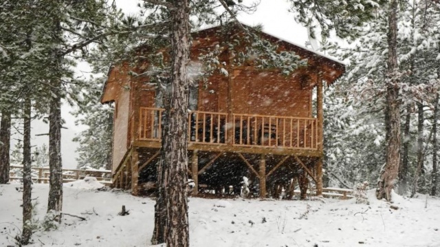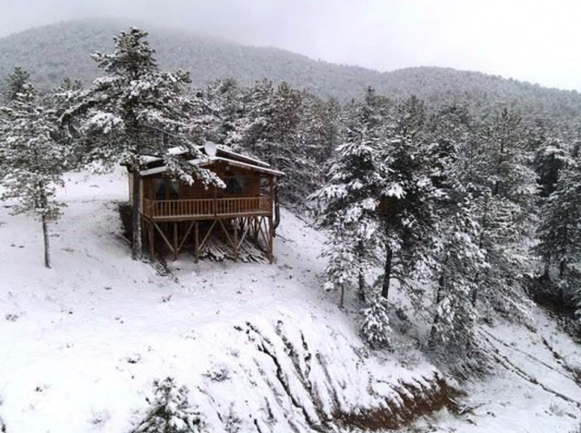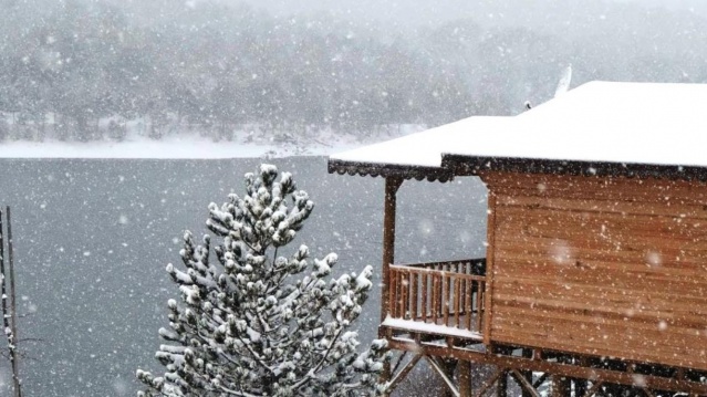 Bungalov evleri ile çam ağaçlarının karla bütünleşmesi adeta görsel bir şölen oluşturdu.