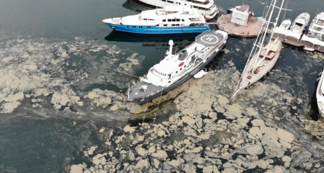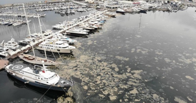 Lüks tekne ve yatların demirlediği marinada deniz yüzeyini kaplayan deniz salyaları çevredekilerde endişeye yol açtı.