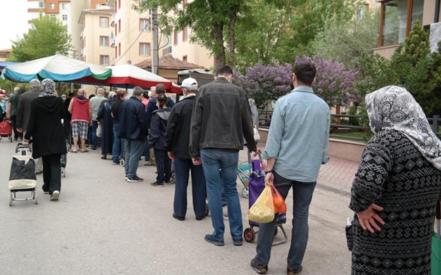 Odunpazarı bölgesi Vişnelik mahallesinde normal şartlarda çarşamba günleri kurulan pazara gelen insanların bazı tezgâhların önünde uzun kuyrukların oluşturması dikkat çekti.