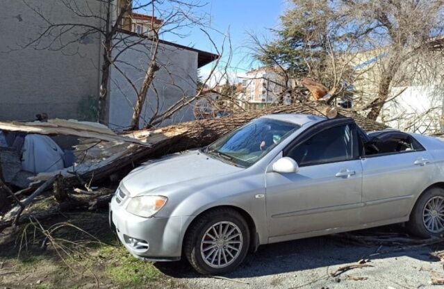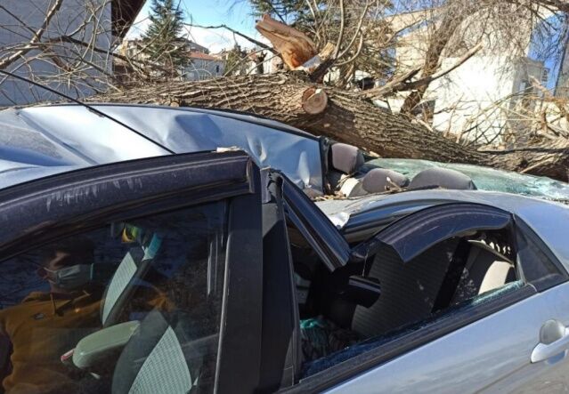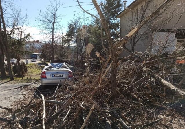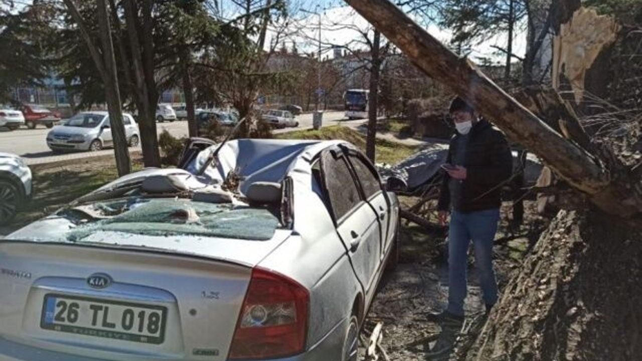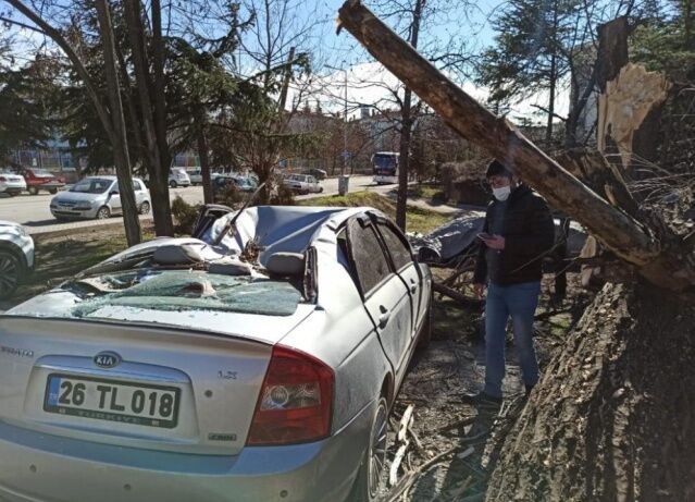 Eskişehir’de öğle saatlerinde başlayan ve şiddeti 89 kilometreye kadar ulaşan şiddetli rüzgâr sonucunda devrilen ağaç park halindeki otomobilin üzerine düşerek maddi hasara neden oldu.