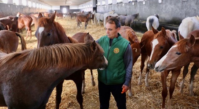 Eskişehir'in Mahmudiye ilçesinde Tarım ve Orman Bakanlığı Tarım İşletmeleri Genel Müdürlüğüne (TİGEM) bağlı Anadolu Tarım İşletmesinde tavla (at ahırı) çavuşu 53 yaşındaki Arif Köse taylarla evladı gibi bakıyor.