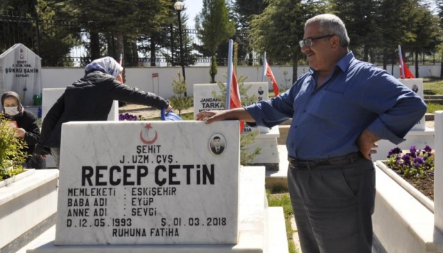 2018 yılında Afrin’de Zeytin Dalı Harekâtında şehit düşen J. Uzm. Çvş. Recep Çetin’in babası Eyüp Çetin, bayram öncesi şehit oğlunun mezarını ziyaret etti.