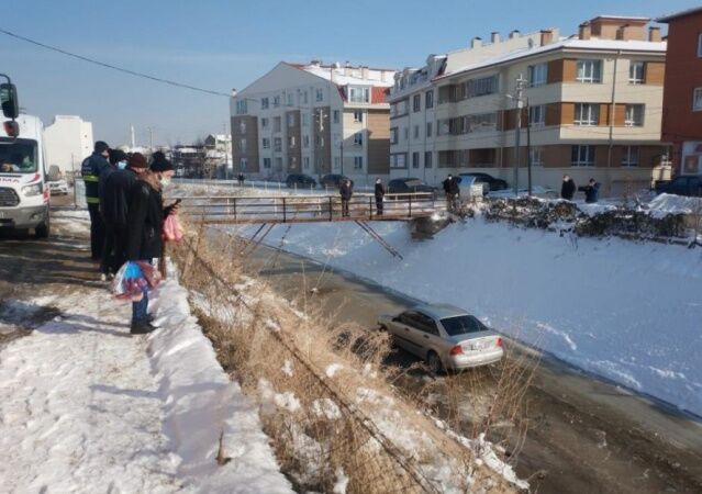 Eskişehir’de, buzlanmanın etkisiyle bir araç kayarak sulama kanalına düşerken, sürücünün yanındaki eşinin el frenini zamanında çekmesi olayın maddi hasarla ucuz atlatılmasını sağladı.