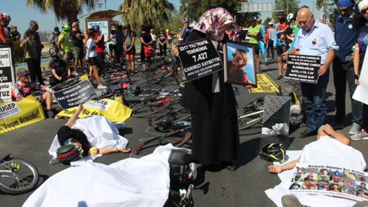 Öte yandan gerçekleşen eylemde dikkat çeken görüntüler de meydana geldi. Bisiklet sürücülerinin ölümlerine dikkat çekmek isteyen grup, bisikletlerini yola yan yatırırken, bazı eylemciler yere yatıp üzerlerine kefen örttü. Grup ellerinde pankartlarla bisikletliler için trafikte ciddi önlemler alınmasını, sürücüler hakkında da caydırıcı cezalar verilmesini talep etti.