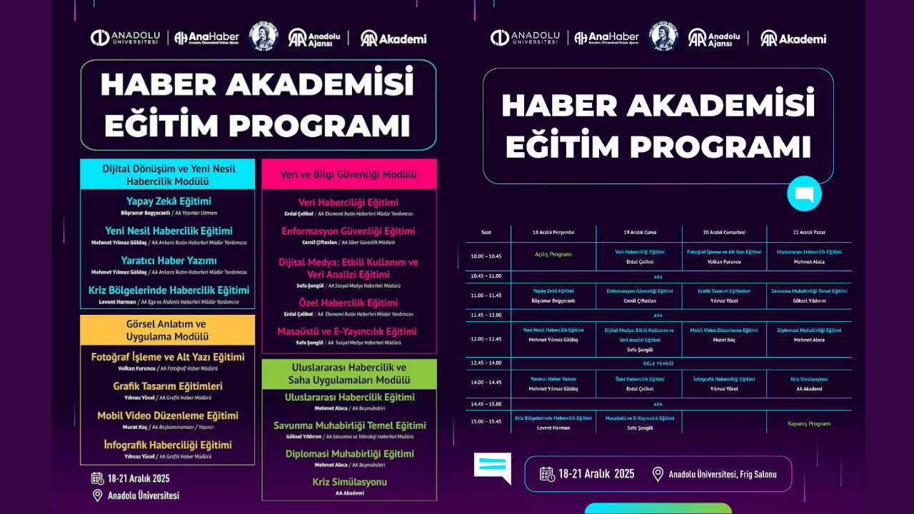 Medya dünyasında dijital dönüşümün ve yeni nesil habercilik yaklaşımlarının masaya yatırılacağı "Haber Akademisi Eğitim Programı", Anadolu Üniversitesi ev sahipliğinde kapılarını açıyor. Kurumsal İletişim Koordinatörlüğü bünyesindeki AnaHaber ile Anadolu Ajansı arasında aylar önce temelleri atılan bu stratejik ortaklık, 18 Aralık Perşembe günü İletişim Bilimleri Fakültesi Şener Şen Salonu’nda yapılacak büyük açılışla resmiyet kazanıyor. Dört gün boyunca sürecek bu yoğun maratonda, sadece bugünün değil, geleceğin medya pratikleri de derinlemesine incelenecek.