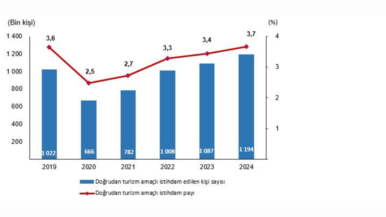 İstihdam tarafındaki veriler ise sektörün çalışan dostu büyümesini tescilledi. 2024 yılında turizm sektörlerinde doğrudan istihdam edilen kişi sayısı, bir önceki yıla göre %9,8 oranında artış göstererek 1 milyon 194 bin kişiye ulaştı. Bu artışla birlikte, turizm sektörünün toplam istihdam içindeki ağırlığı %3,7 olarak gerçekleşti. Ulusal hesaplarla uyumlu olarak hazırlanan bu veriler, turizmin hem istihdamı destekleyen hem de ekonomik büyümeye doğrudan katkı sunan stratejik yapısını bir kez daha teyit etti.
