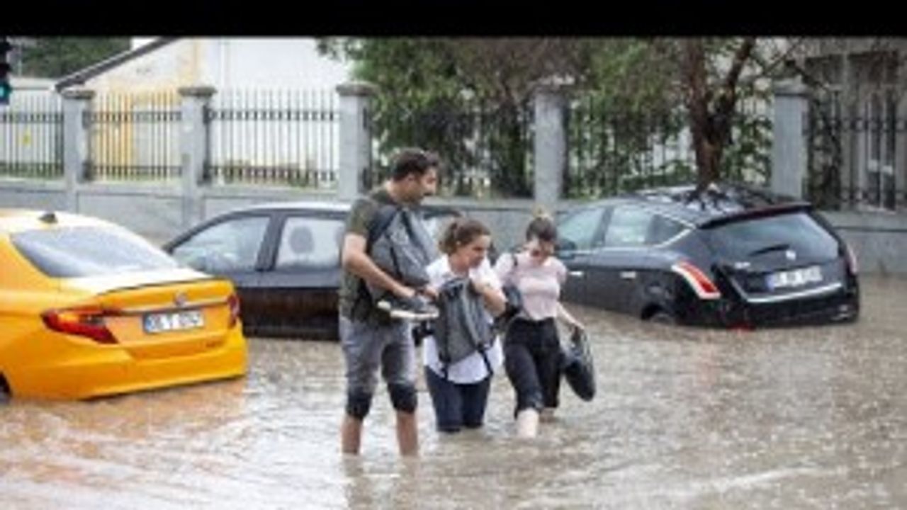 Ankara'da öğle saatlerinden itibaren aniden bastıran kuvvetli yağış günlük yaşamı olumsuz etkilerken, Yenimahalle'de suyla kaplanan yolda kalan minibüsün yolcuları iş makinesiyle tahliye edildi.