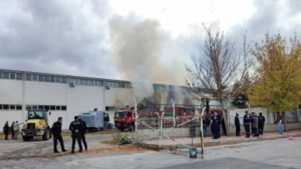 Eskişehir Organize Sanayi Bölgesi’nde (EOSB) bir ambalaj farikasında çıkan yangın söndürülmeye çalışılıyor.